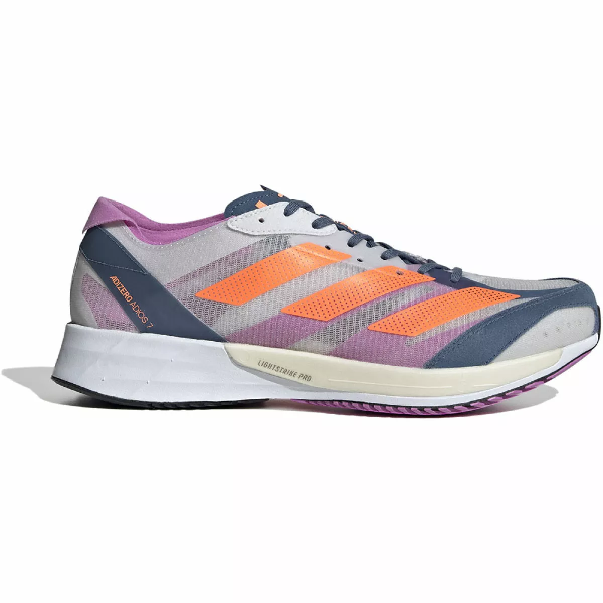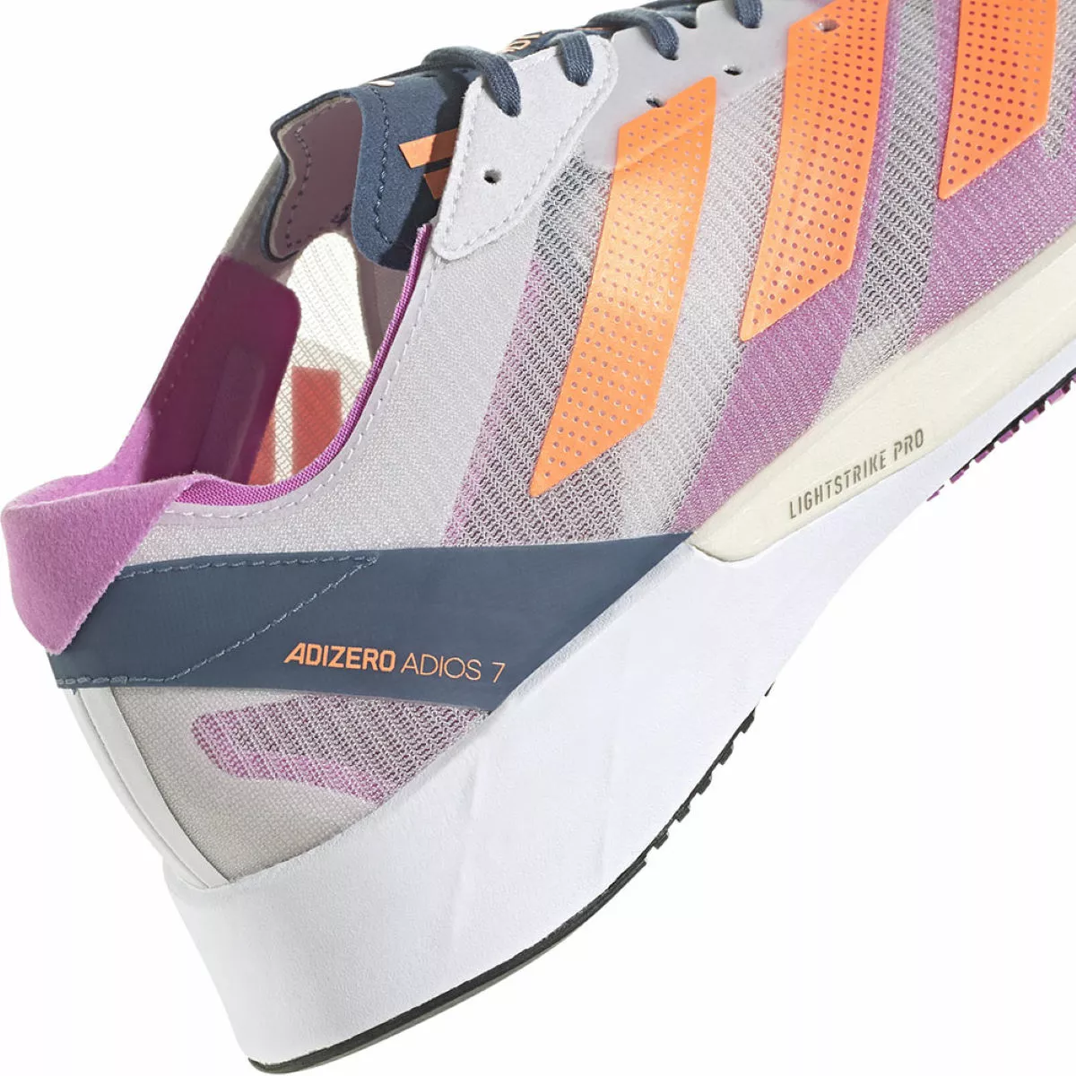 Tuned for speed, the adidas Adizero Adios 7 Running Shoes are built for chasing down your next personal record. Crafted with a lightweight and breathable mesh upper that delivers a secure fit with a traditional lacing system and allows your feet to breathe so your temperature stays regulated when you pick up the pace. The upper has also been constructed with at least 50% recycled content to save resources and reduce waste.