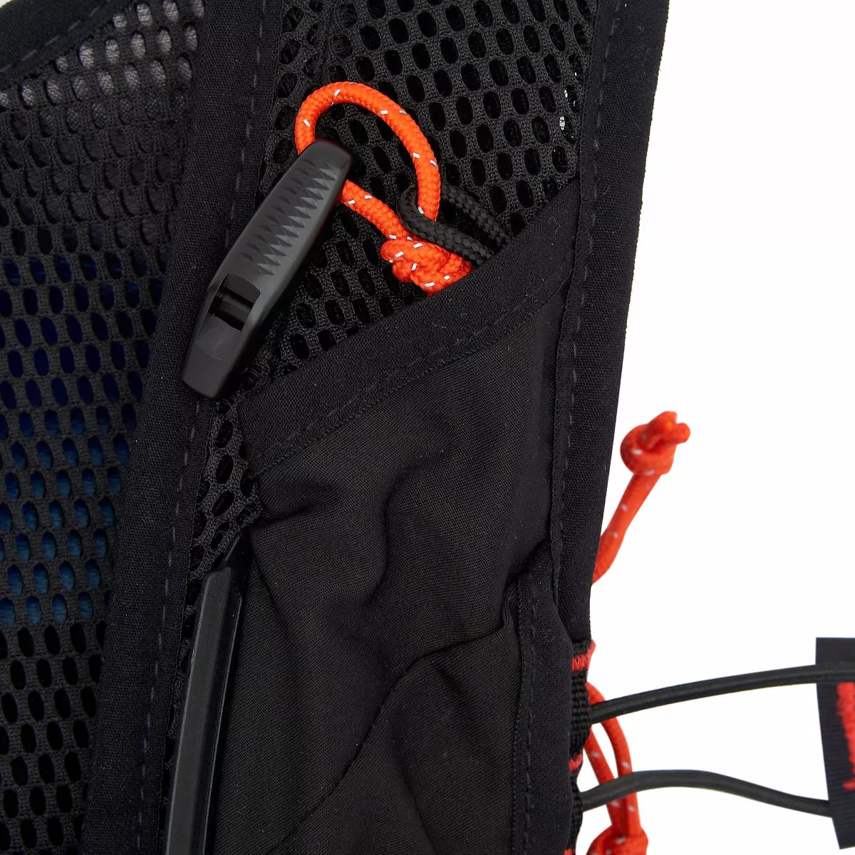 La forma de la correa para el hombro y el ajuste de velcro permiten una distribución equitativa del peso y un ajuste cómodo cuando estás en movimiento. El amplio espacio de almacenamiento en la parte delantera y trasera, un total de 8 bolsillos, deja espacio para guardar la nutrición y otros elementos esenciales para correr. Uno de esos bolsillos también tiene cremallera, lo que te permite guardar objetos de valor de forma segura durante tu aventura.