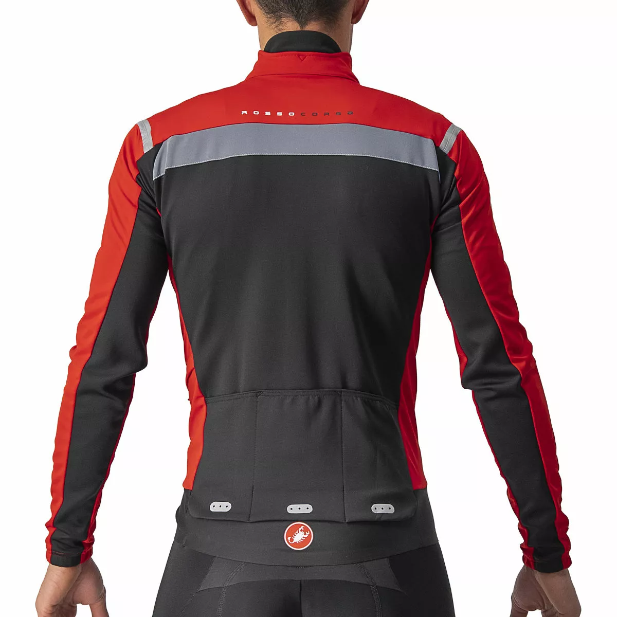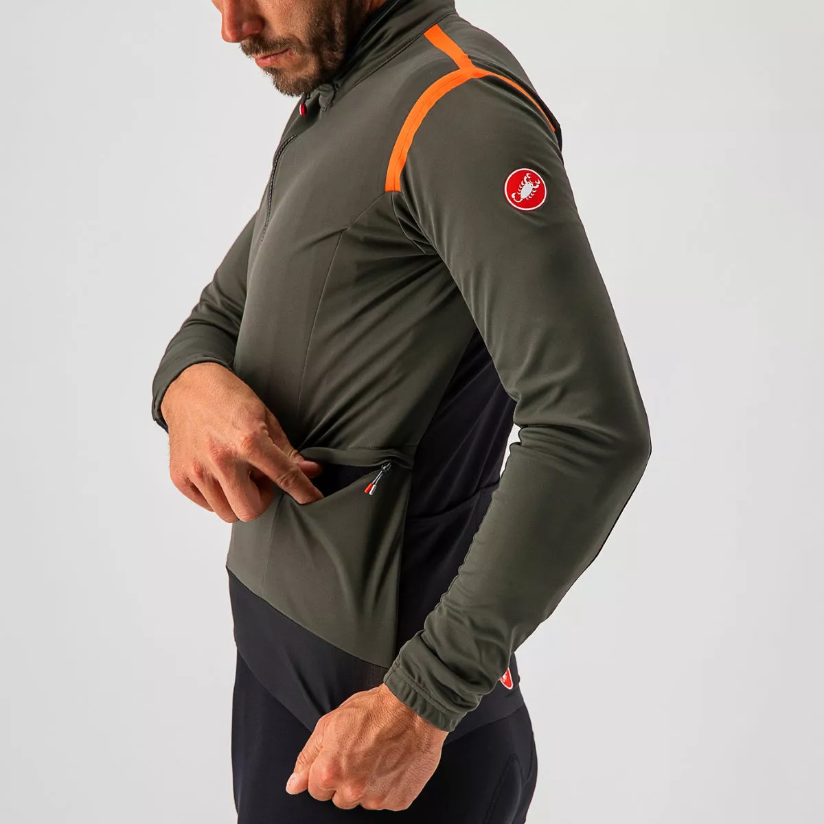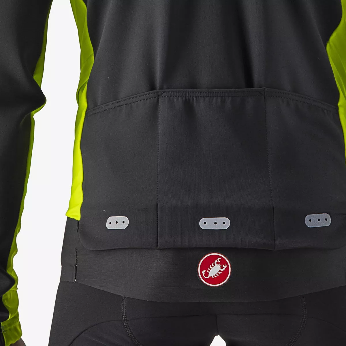El patrón avanzado lo convierte en un excelente ajuste ceñido al cuerpo, el estiramiento adicional en la cintura mantiene el ajuste elegante mientras que la cintura sin bordes queda plana y se mueve contigo. Acabada con una pinza de texto de silicona Castelli en la cintura, evita que el maillot / chaqueta se suba. Tres bolsillos traseros con orificios de drenaje reflectantes cortados con láser más un bolsillo frontal con cremallera se encargan de todas las necesidades de almacenamiento.