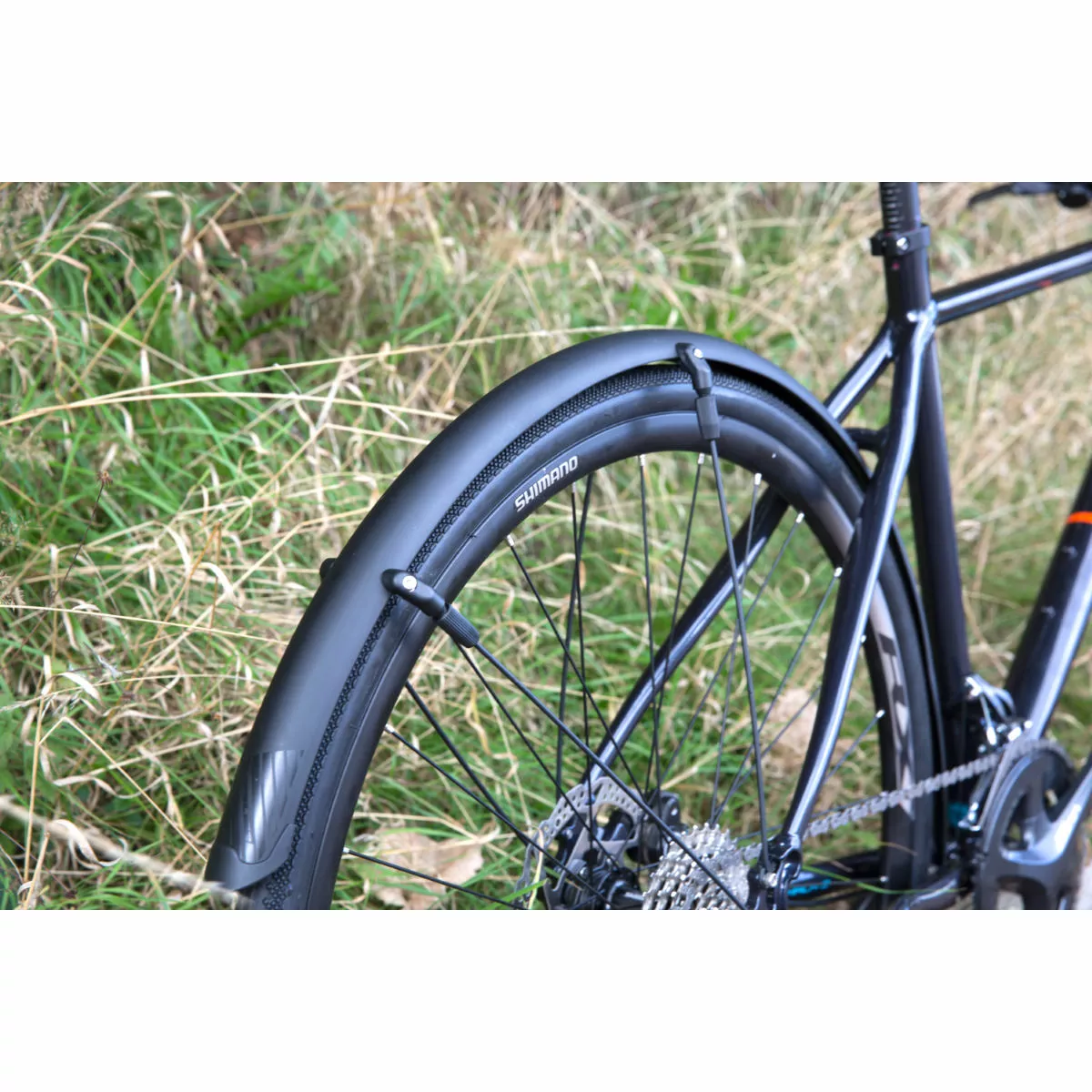 Estos guardabarros de longitud integral ofrecen una protección máxima contra el agua estancada para mantenerte el cuerpo y la bicicleta limpios y secos incluso en las peores condiciones.