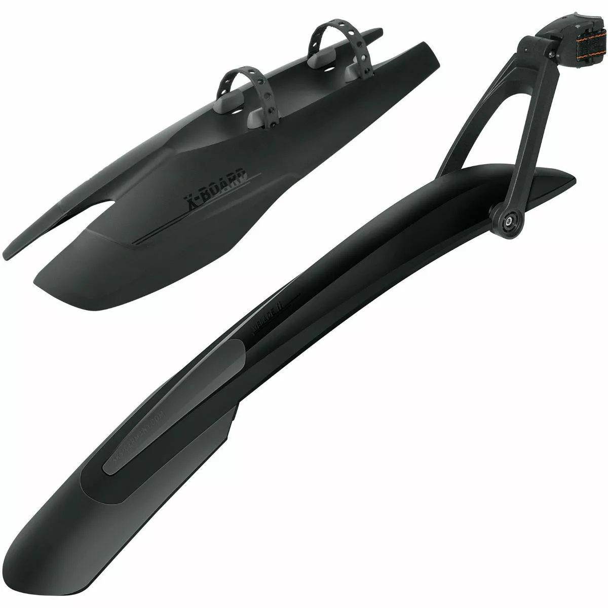 Guardabarros de MTB de alta calidad y ajuste por enganche para ruedas de 650b y 29″. El juego está compuesto por dos guardabarros: uno delantero y otro trasero. El X-Blade es un guardabarros de dos componentes diseñado para la rueda trasera de las bicis de montaña. Debido a su sistema de cierre rápido, el X-Blade puede colocarse en casi cualquier tija de sillín y ajustarse de un modo óptimo sobre la rueda mediante su tecnología de unión doble. Por otro lado, el X-Board es un guardabarros delantero innovador que incluye correas de goma para ajustarlo por debajo del tubo inferior, además de presentar el mismo diseño de dos componentes que el X-Blade para ofrecer un par a juego. Se incluyen espaciadores ajustables para cables.
