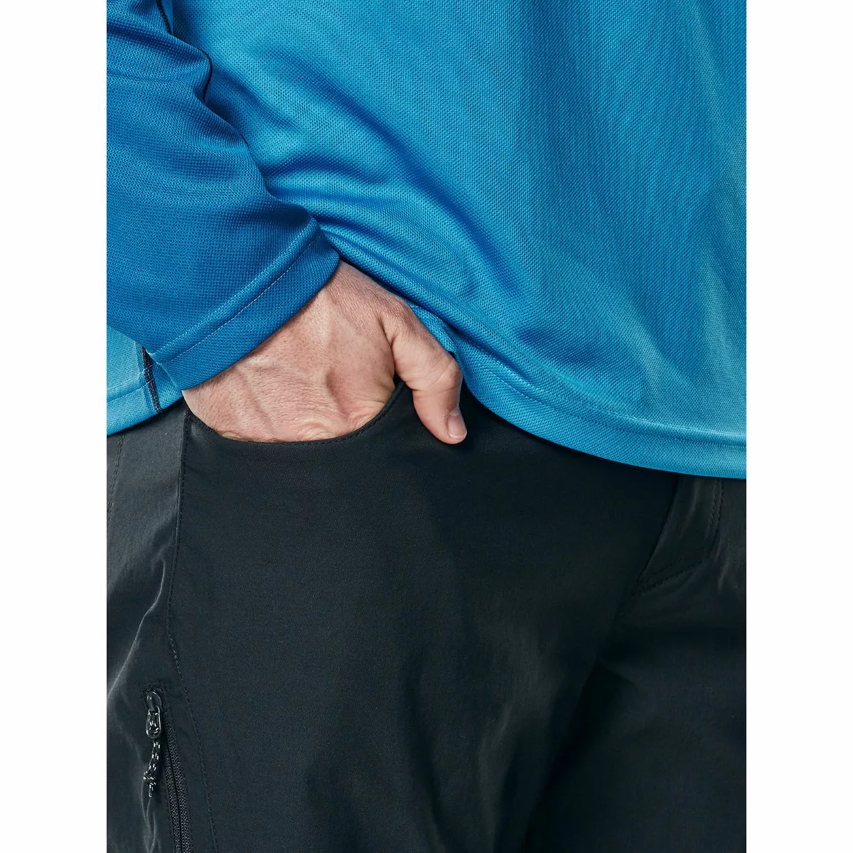 Resistente al agua con acabado DWR Facilidad de movimiento gracias a las rodillas articuladas y al tejido bidireccional duradero Ventilación mejorada a través de respiraderos de muslo con cremallera que fluyen libremente Bolsillo de seguridad con cremallera de fácil acceso Largo de pierna regular Los tejidos aprobados por Bluesign utilizan menos agua y productos químicos 90% Poliamida, 10% Elastano