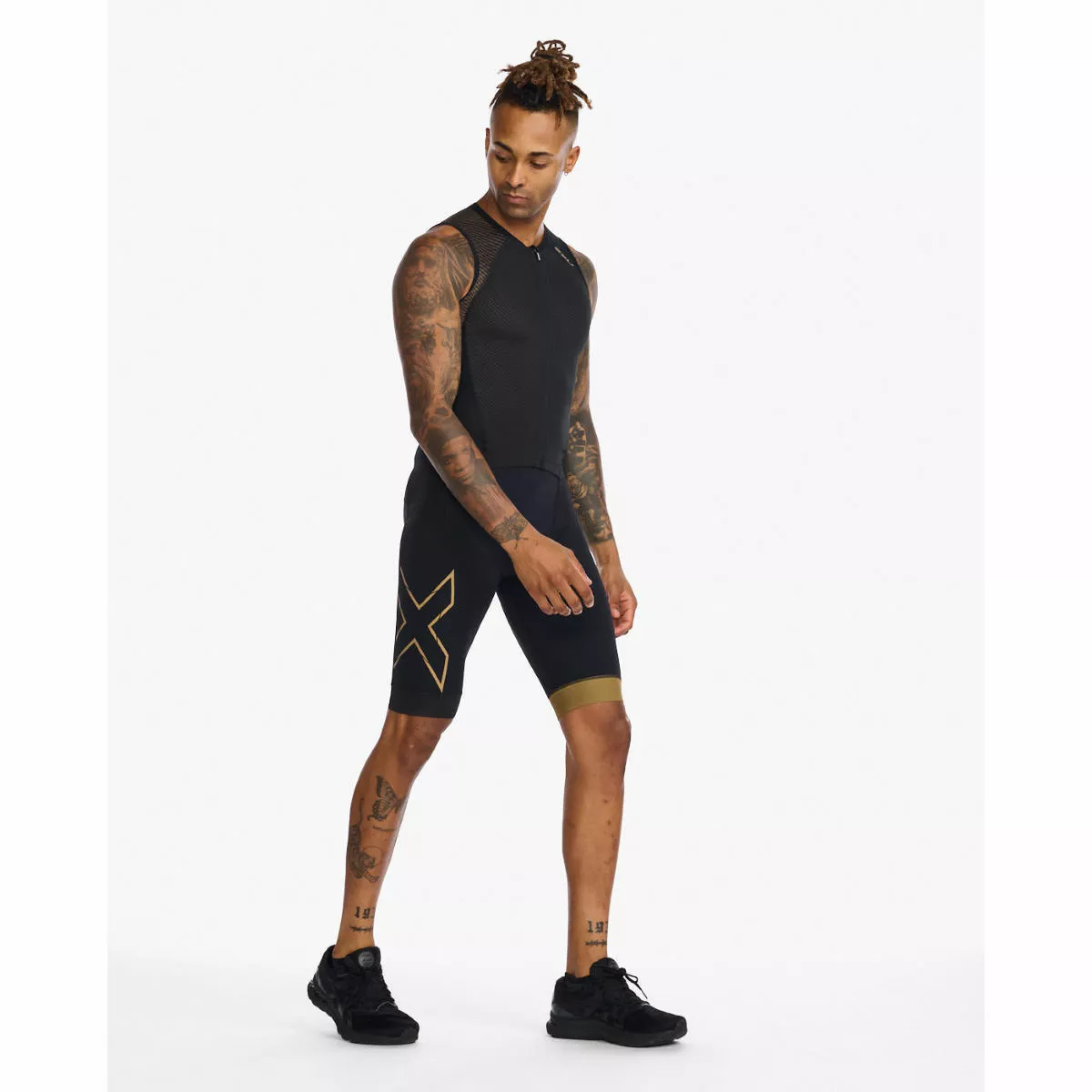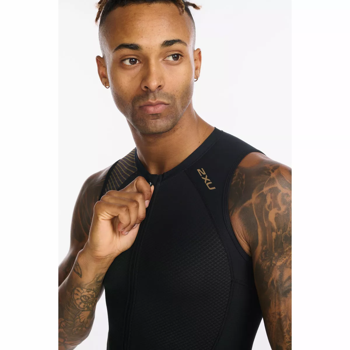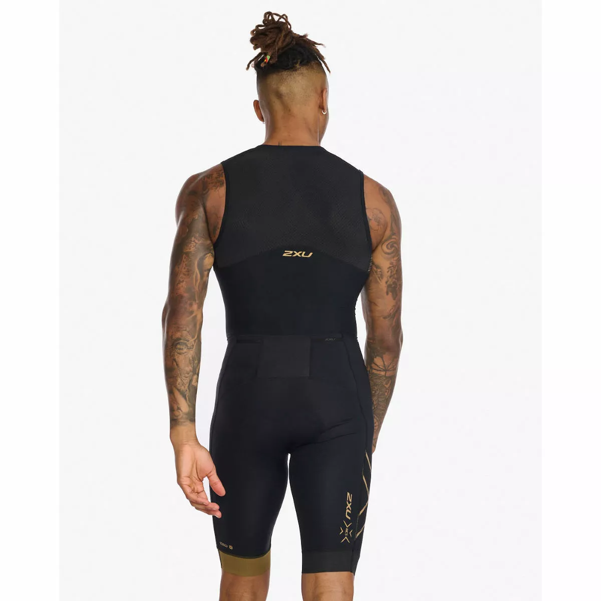 Tritraje sin mangas Paneles ergonómicos Parte inferior del cuerpo PWX VENT Estampación de contención del músculo cuádriceps (MCS) Cuerpo premium italiana SBR VENT Parte superior del cuerpo y canesú trasero Advanced Swiss COLDBLACK Pinzas de silicona para piernas de primera calidad con ingeniería italiana Gamuza de triatlón TMF® Light Speed Cierre semi-automático con cremallera integral Bolsillos traseros en forma de sobre de fácil acceso 80% Nailon, 13% Poliéster, 7% Elastano