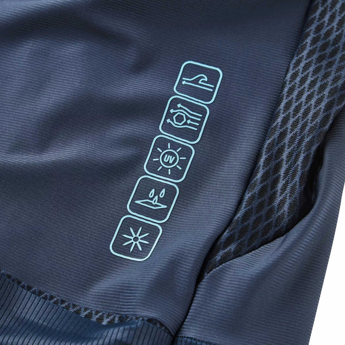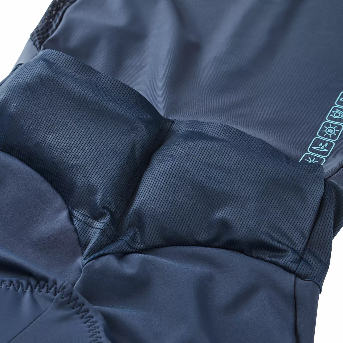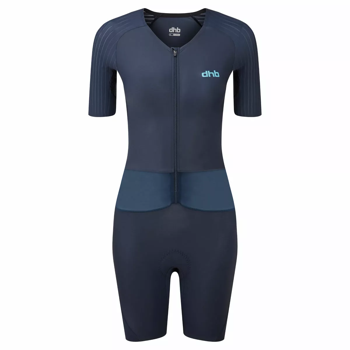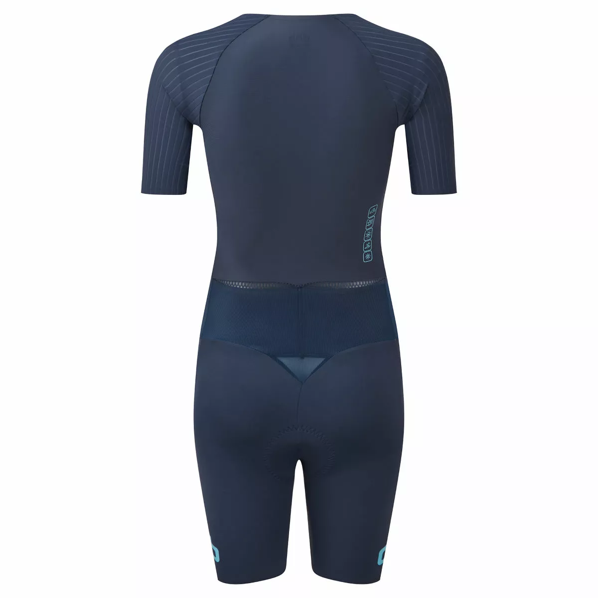 Diseñado para triatletas competitivos Adecuado para triatlones de larga distancia Construcción de doble bolsillo en la cintura trasera con una abertura pegada para un fácil acceso Dobladillos pegados para una transición suave del traje a la piel Pinza de silicona para piernas con dobladillo sin rematar Axilas de malla que absorben la humedad para ventilación Capa de DWR (tratamiento duradero de resistencia al agua) Inserciones: 94% Poliéster, 6% Elastano Mangas: 80% Poliamida, 20% Elastano Parte inferior: 74% Poliamida, 26% Elastano parte superior: 77% Poliamida, 23% Elastano