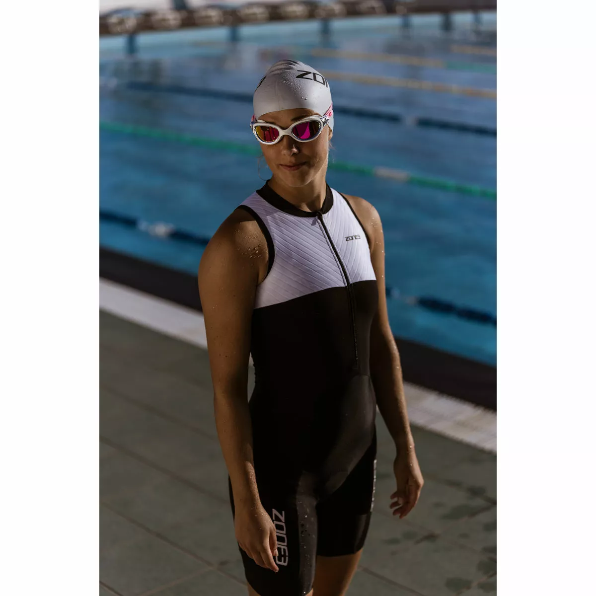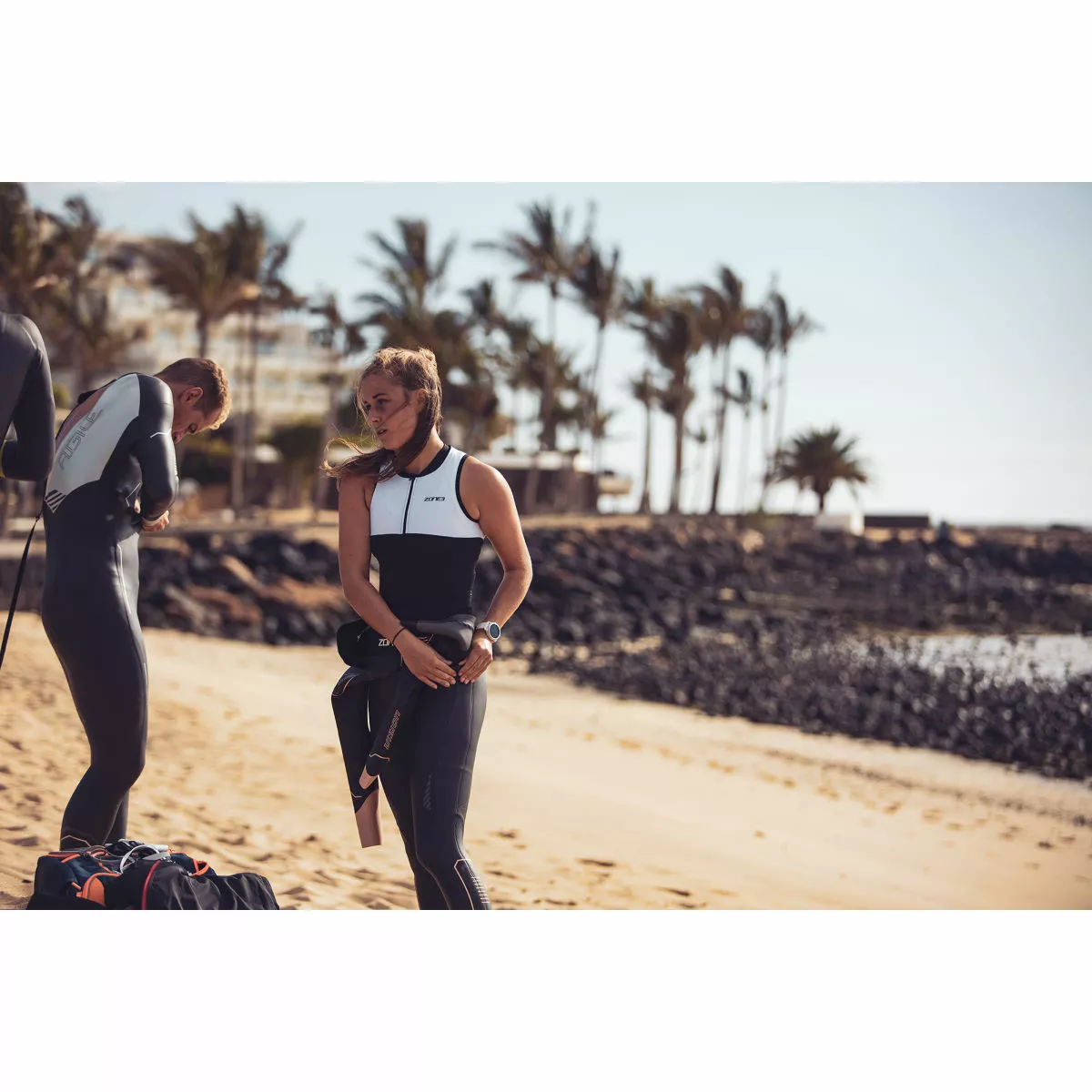 El traje de triatlón sin mangas Lava de larga distancia para mujer Zone3 está confeccionado combinando lo mejor en materiales técnicos franceses e italianos de rendimiento deportivo, que incluyen: