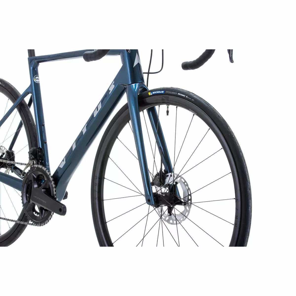 La Vitus Vitesse EVO CRS con un grupo electrónico Shimano Ultegra Di2 de 12 velocidades es una bicicleta de carretera ligera de alto rendimiento que está lista para carreras en carretera de alto nivel. Pero esta no es solo una bicicleta para el camino ascendente porque lo que sube debe bajar. Afilada en las subidas, pero también ágil en los descensos y capaz de mantener la velocidad en llano. Para ser una gran bicicleta de carretera versátil, incluso para ganar un evento del Grand Tour, debe funcionar en todas partes..
