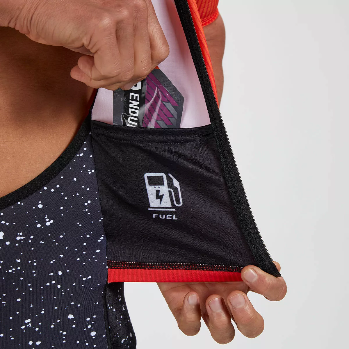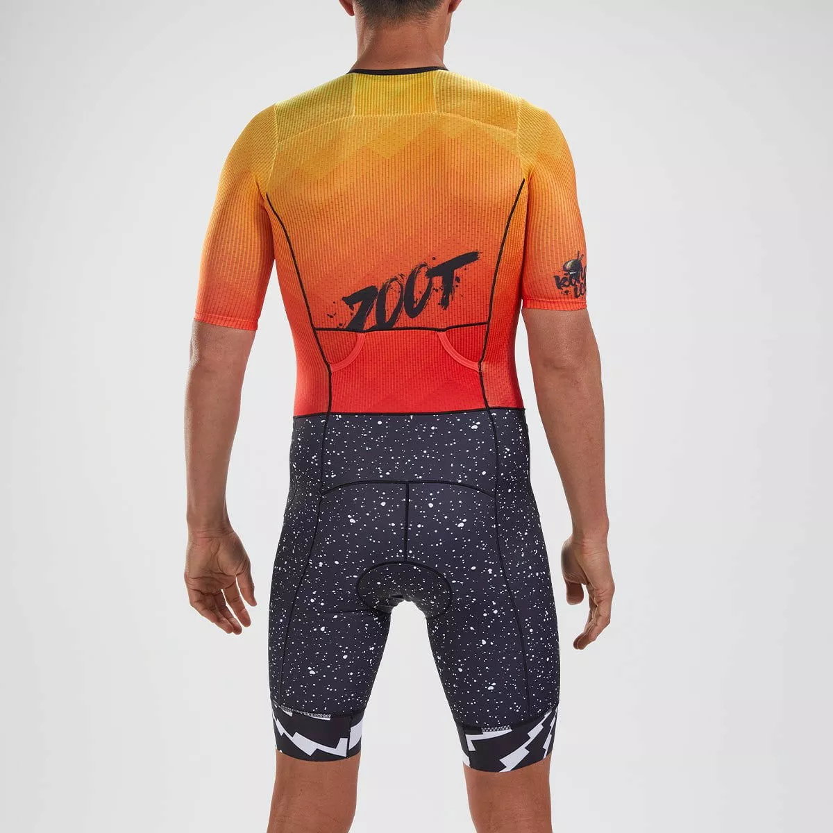 Zoot LTD Kona Ice Tri Aero Full-Zip Racesuit is built to perform with integrated compression and improved aerodynamics. Sublimated Italian Shield fabric alongside Vento 4-way stretch mesh provides moisture management, advanced flexibility and enhanced breathability. Designed with a front zip for easy ventilation and a no-sew zipper garage to eliminate any irritation while two side pockets on the hips and a kangaroo centre back pocket provide storage. Including two Internal Ice Pockets on the front for targeted cooling of your kidneys and a neck pocket to keep your head cool. Preventing chafing, the suit uses a Seamlink stitch construction to ensure next-to-skin comfort and minimise irritation while stretching with your movements and updated set-in sleeves to reduce wrinkles, enhance breathability and improve aerodynamics. Meanwhile, exclusive Italian leg grippers are integrated into the suit’s design which provides breathable secure compression that keeps the leg hems in place and helps stabilise the suit.