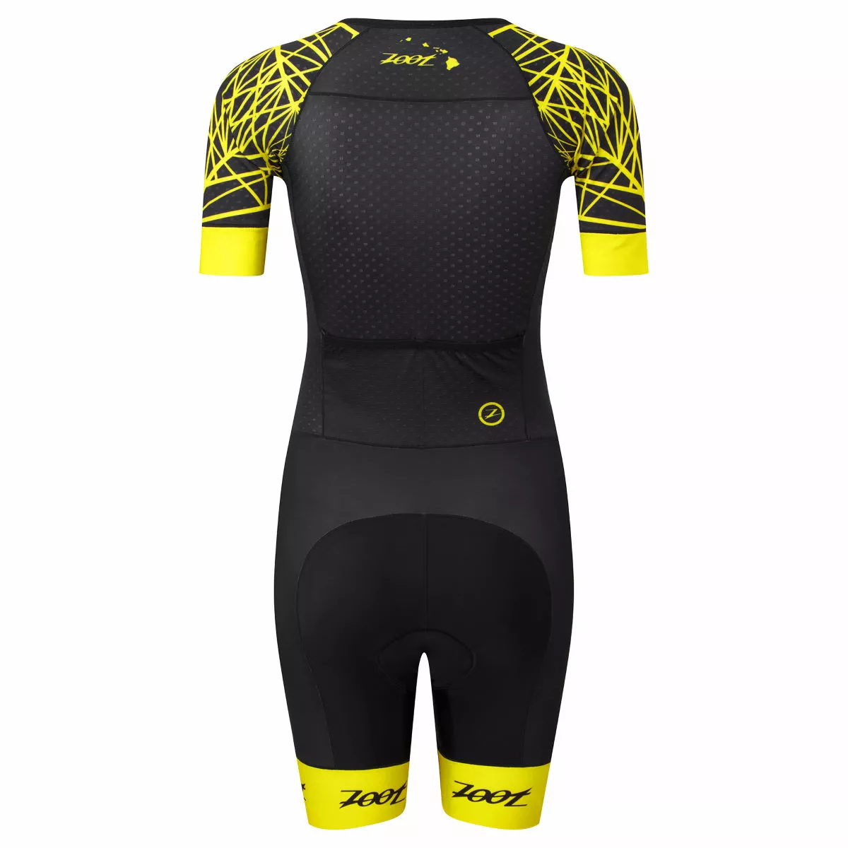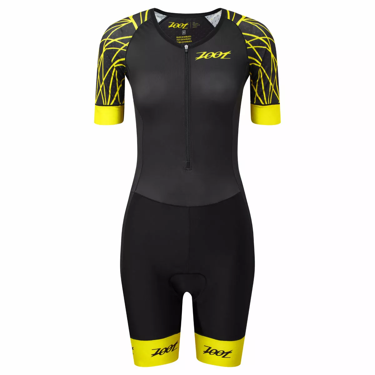 Built to provide maximum comfort on race day, the Zoot Women’s Essential Short Sleeve Trisuit is crafted from sublimated Italian fabric that provides breathability and moisture management to keep you dry and your temperature regulated. An Integra SBR 2D pad provides support where you need it most and a dropped back construction provides coverage and optimal mobility so you can move without restriction. A long front zipper with a semi-lock puller can be adjusted for added ventilation while elastic cuffs and waistband give a secure fit. Leg cuffs with a skin-friendly zipper prevent the shorts from riding up and a two-part open back pocket provides easy access storage. Finished with a UPF 50+ treatment to provide protection in sunny conditions.